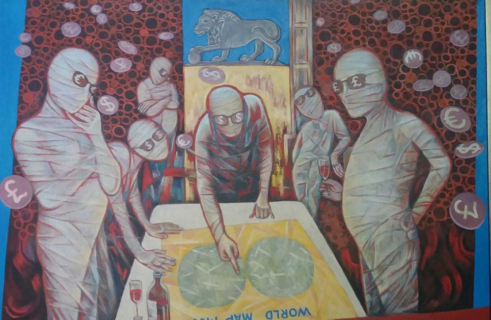 Мына таптым. Эки картинасы илиниптир. Көз да жакшы көрбөй жанына барып окусам “Борьба за место под солнцем” жана “Деление мира”. Көпкө турдум. “Дүйнөнү бөлүштүрүүнү” карап Асатилла агай рубль, сом иштетпейт ко деген ойго келдим. Түшүнүктүү карта иштетет. Бирок евро, доллар гана сүрөткө тартылган. Юань* издедим таппадым. Мээси, жан-дүйнөсү бүт акча болгон адамдар. Көздөрүнө ар бир нерседен акча жасоо көрүнөт. Кантип байысам? Кандай кыла койсом? Бирди эки, экини үч кылсам деген жан-дүйнөсүндө бир мээримдин, жылуу илептин жышааны жок, ок өтпөгөн, ууланбаган мумиё сыяктуу өлбөчүдөй напсисин агыткан кишилер. Аябай дүйнөдөгү маанилүү пайда түшчү жерлерди бөлүштүрүп атат. Мына Сорос аке “быйыл сахарный тростниктерге мен эле монополия болоюн”-десе, тигинде Иллон Маск “мен эле космоско учурайын”- ана Форд против Феррари деп чыкты бирөө. Детройт Мичиган штатынан бирөө келген. Айтып жатат: “Около пятой части доходов от продаж продукции и предоставляемых услуг составляет федеральный клиентский сектор обслуживания военных заказов(без учета иностранных заказчиков американского вооружения и военной техники) кокууй, Асатилла агай, кыргыздар эпик, кайып дүйнө сизде барбы? Бул сай медиреп дүйнөнү алдагандарды, дүңүнөн эле бир айтып коюптурсуз го...